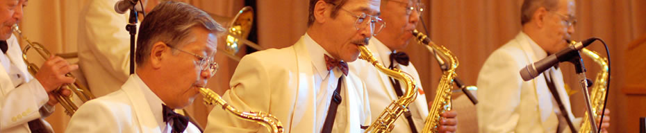 リーダー・篠崎哲也氏率いるメンバーは、トロンボーンやトランペットの管楽器、ピ