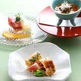 穀物、野菜、ミネラルを豊富に含んだ3億年前のモンゴル岩塩など、身体に自然のエネルギーを補う食材をあしらい、旬の素材を中心に、肉や魚をあわせたヘルシーな全6品の和風モダンなフレンチ・フルコースメニューです。旬のフルーツをたっぷりあしらった彩り鮮やかなデザートも好評です。